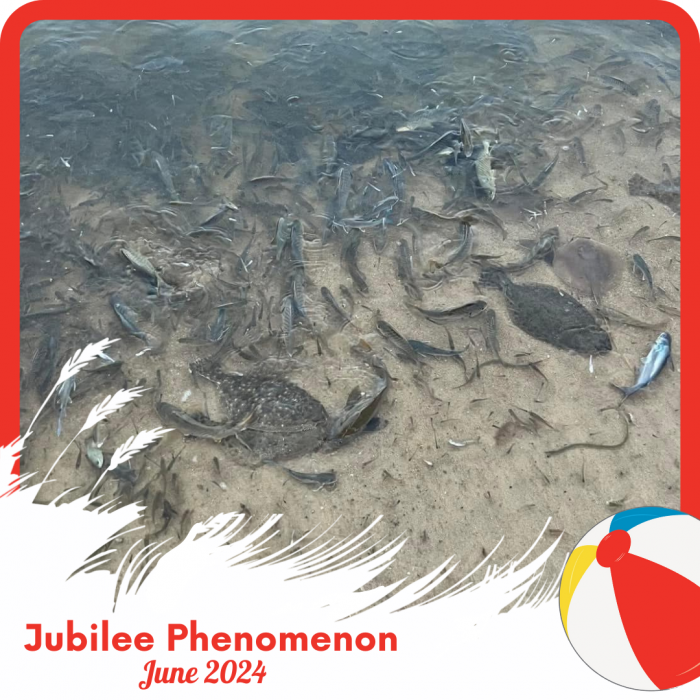 Jubilees happen when conditions are just so– usually in the early morning hours of a hot summer day, typically between June and September. A perfect storm of calm winds, rising sun, and a gentle east wind sets the stage. Add in a drop in oxygen levels in deeper waters and voilà! Fish and crustaceans head for the hills (or rather, the shallows) to catch their breath.