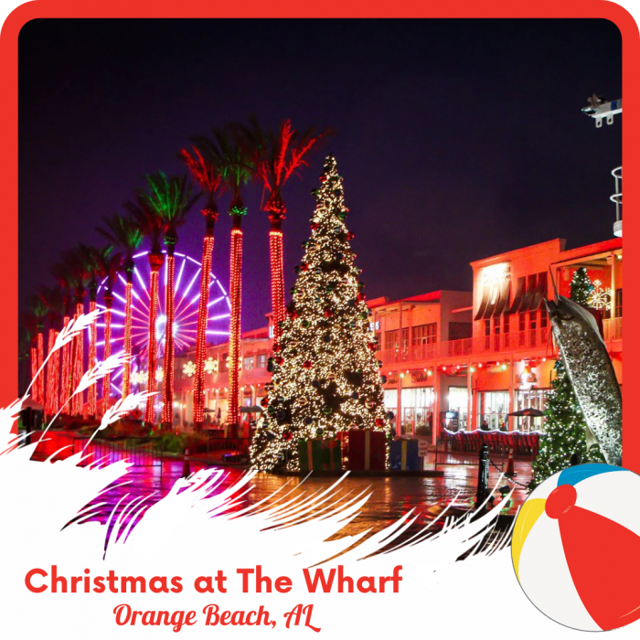If your idea of holiday photos includes twinkling lights, peppermint colored décor, and the charm of a small-town Christmas movie, The Wharf in Orange Beach is your spot.